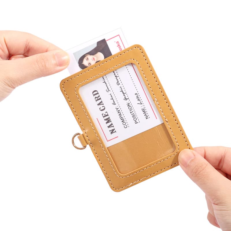 This name badge holder’s made of good PU leather. It lasts long, won’t wear out, and feels smooth. Skilled workers hand - stitched it, lines are neat, no breaks. Front has a clear window for info; back’s smooth PU leather to protect.