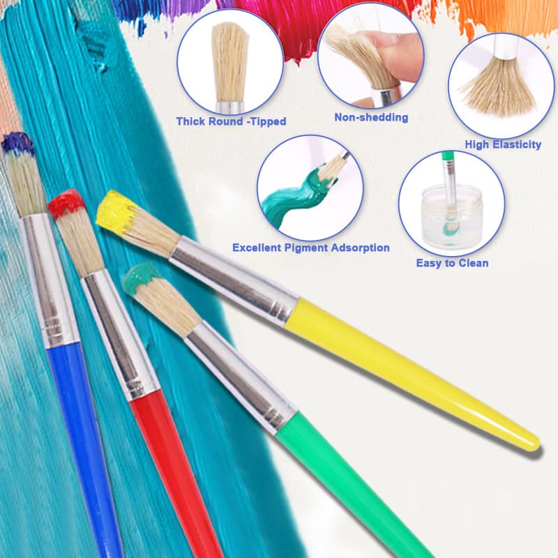 Our kids' painting brushes boast premium bristles: resilient, non-shedding, and elastic for seamless strokes. They absorb pigments effectively for vibrant colors, with rounded tips to protect paper, ensuring safe, enjoyable painting.